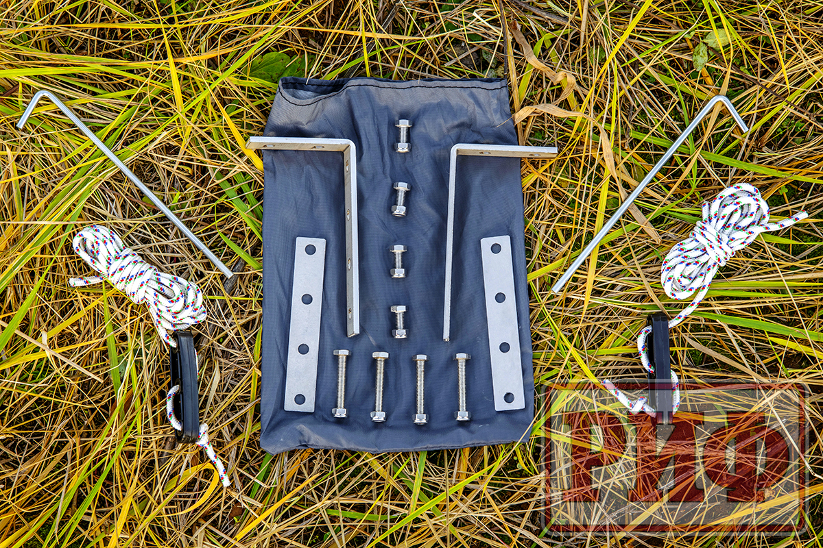 Установка тента под силу даже одному человеку и занимает не более двух-трех минут. В комплект входят веревочные растяжки с возможностью регулировки натяжения и металлические колья для крепления к грунту.
