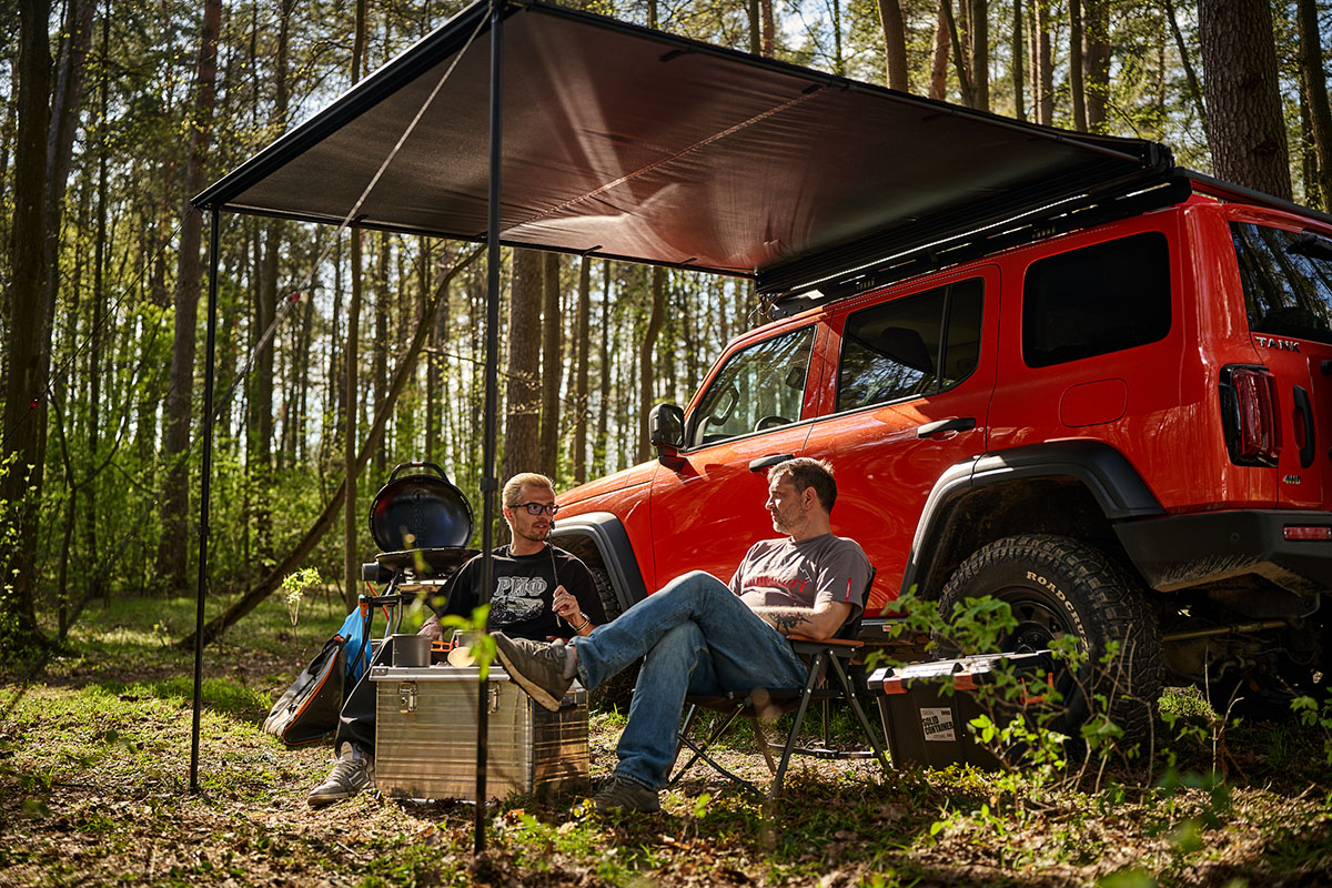 Такой тент позволяет с комфортом разместить рядом с автомобилем трёх-четырёх человек.