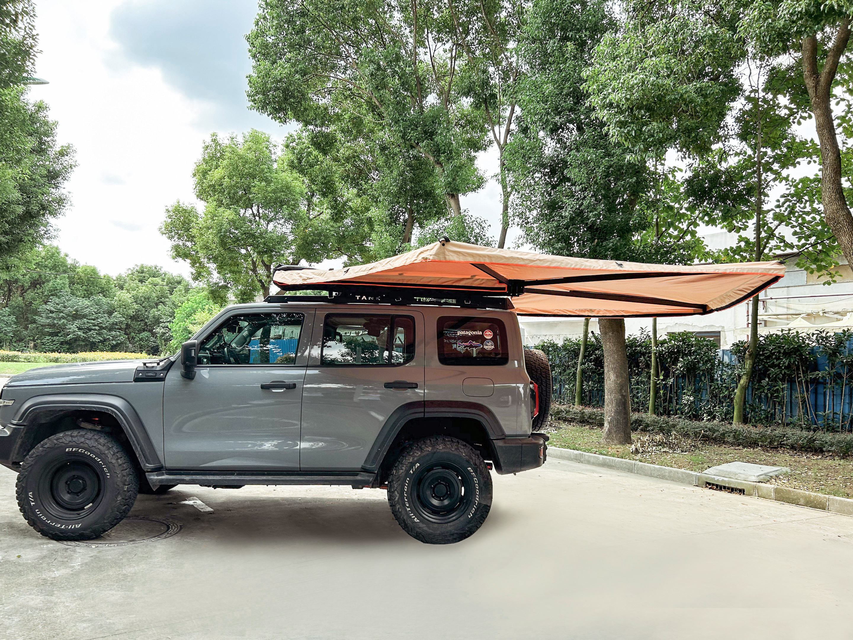 Размер тента в рабочем состоянии: 2 метра по стороне, которая крепится к автомобилю и 2 метра по вылету. Такой тент позволяет с комфортом разместить рядом с автомобилем 4-5 человек.