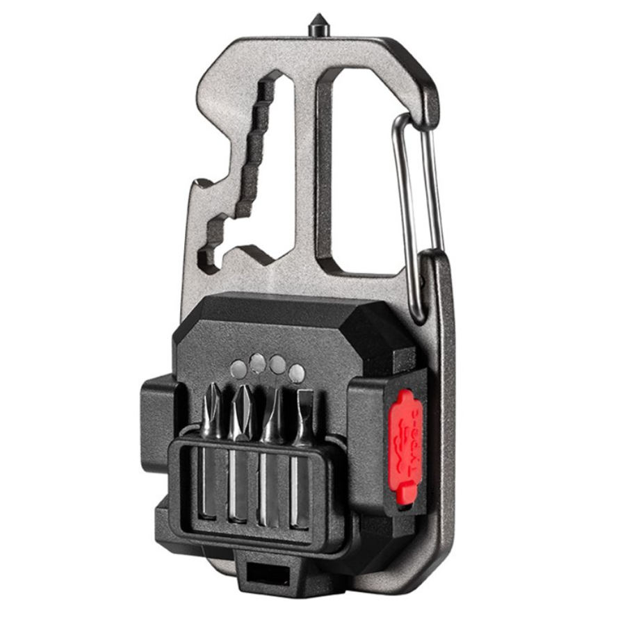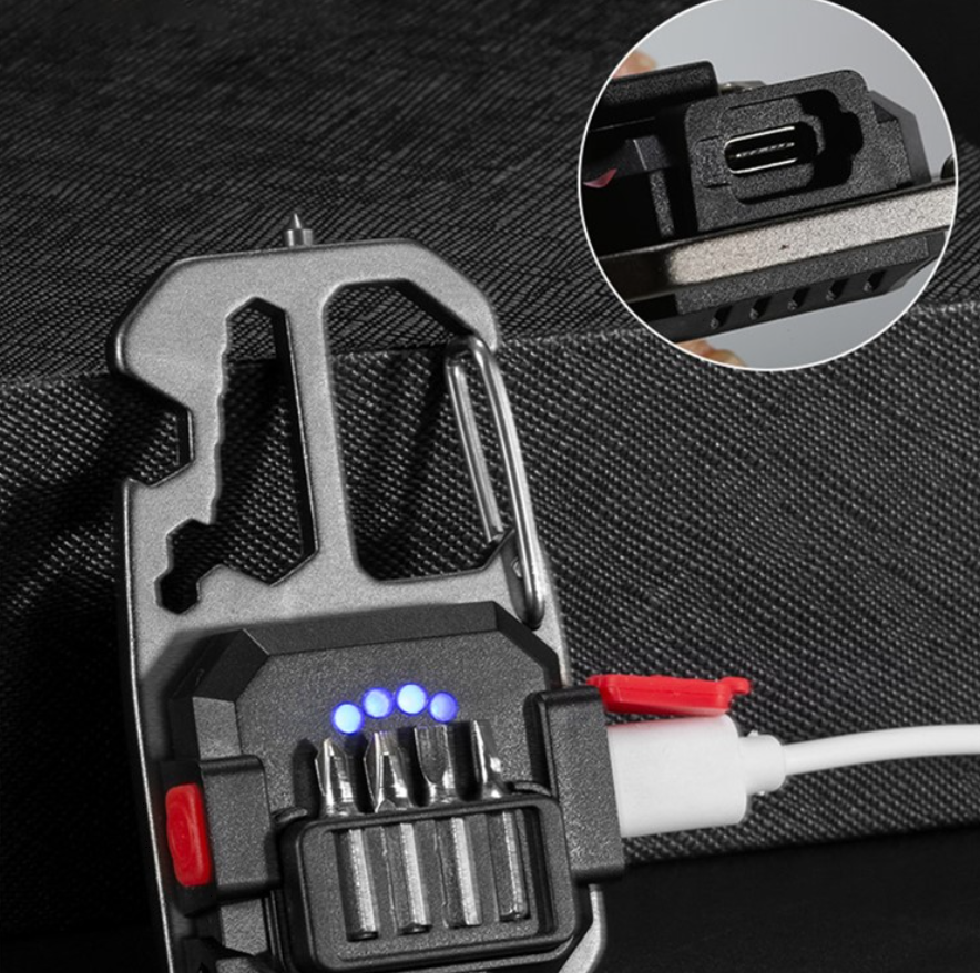 - Комплектация: фонарь, провод для зарядки, коплект из 4 бит, стеклобой, карабин, открывашка, велосипедный ключ